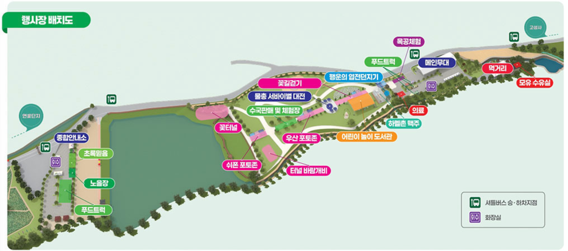 축제장 중심에는 메인무대가 설치되어 매일 저녁 다양한 초청 가수들의 공연이 열리며, 오전~오후 시간대에는 체험부스와 장터, 어린이 놀이존이 운영됩니다.