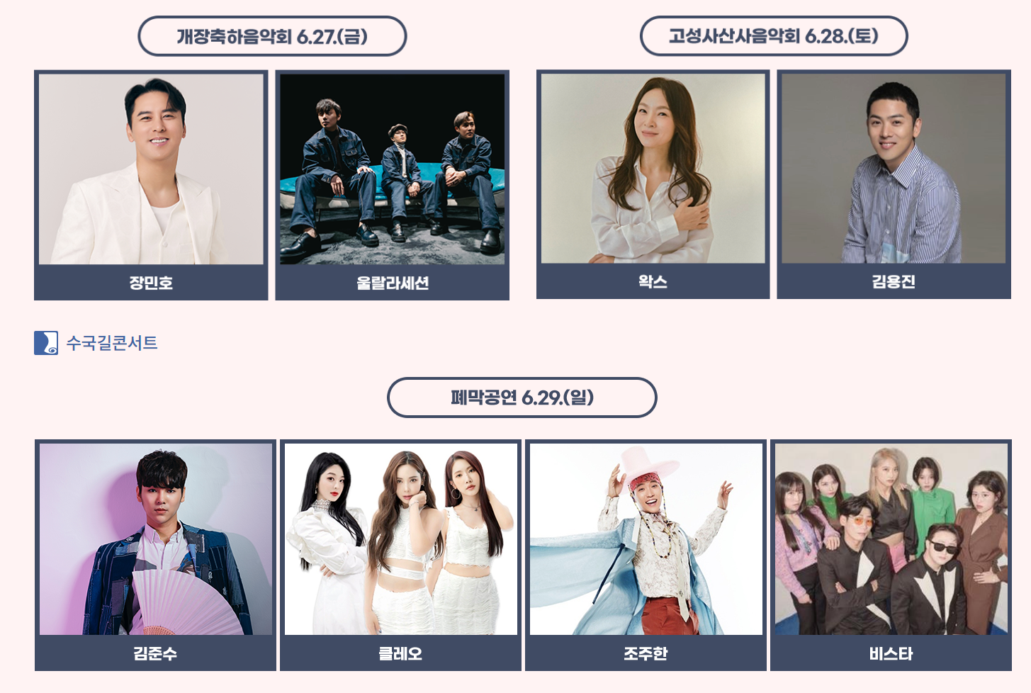 마지막 6월 29일 일요일에는 김준수가 축제의 피날레를 화려하게 장식하며, 클레오, 조수한, 비스타 등이 함께 무대에 오를 예정입니다. 모든 공연은 메인무대와 고성사 무대 두 곳에서 분산되어 운영되며, 좌석은 별도 지정 없이 선착순으로 입장하게 됩니다.